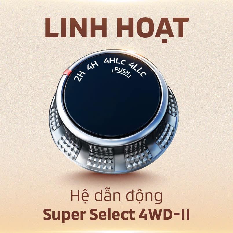 Hệ thống dẫn động Super Select 4WD-II cho phép chuyển chế độ lái linh hoạt, dễ dàng chinh phục địa hình khó.