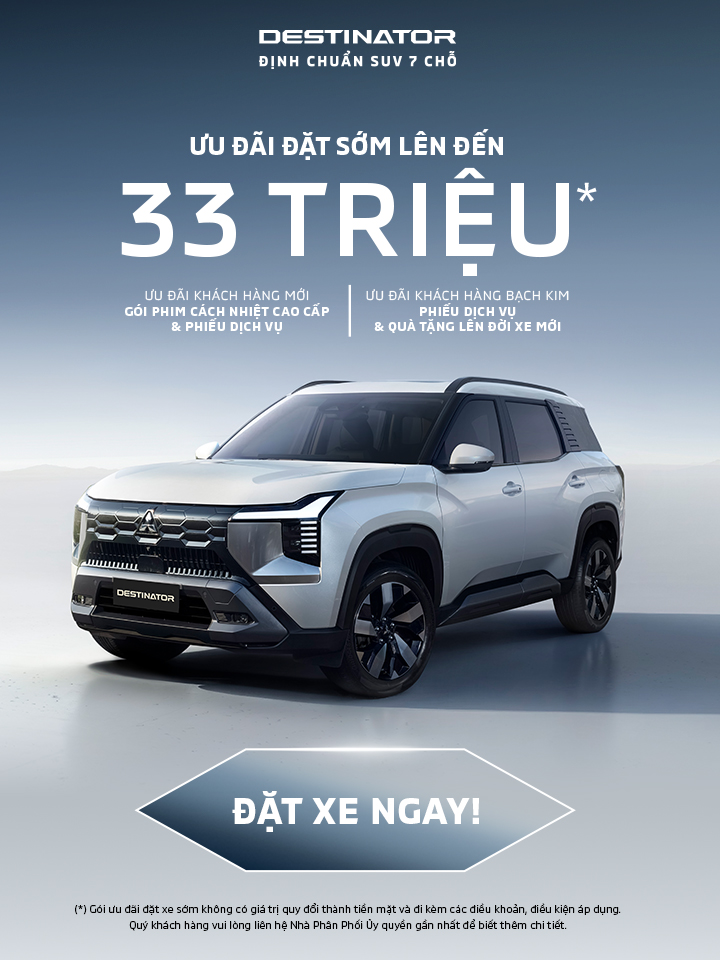 Mitsubishi Motors Việt Nam phối hợp cùng hệ thống nhà phân phối (NPP) ủy quyền trên toàn quốc triển khai chương trình ưu đãi với giá trị lên tới 33 triệu đồng dành cho khách hàng đặt cọc sớm mẫu xe Mitsubishi Destinator – mẫu xe SUV 7 chỗ hoàn toàn mới, dự kiến ra mắt tại Việt Nam vào cuối năm 2025.